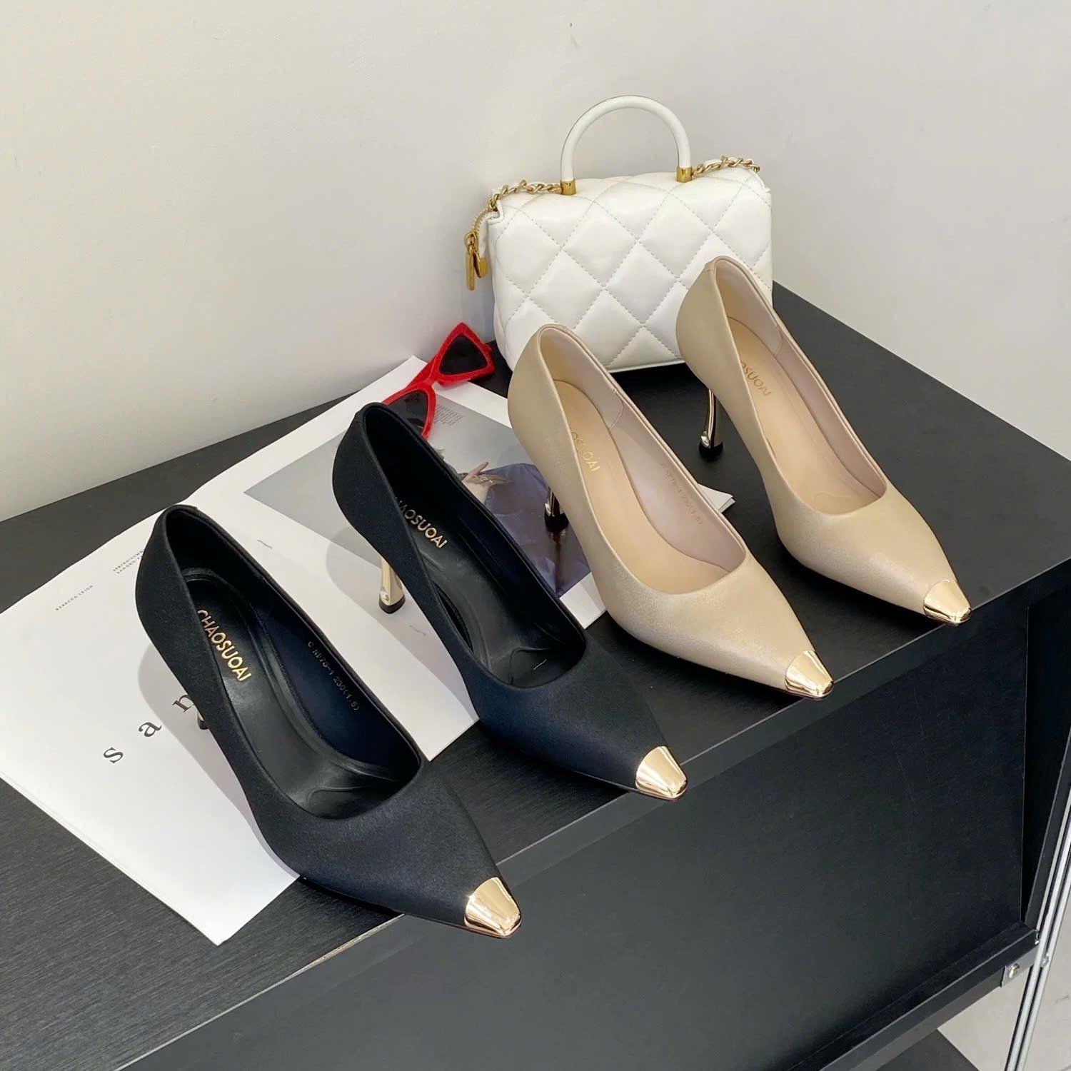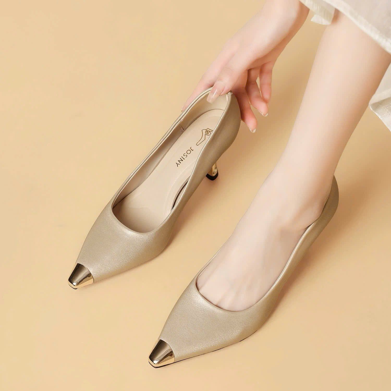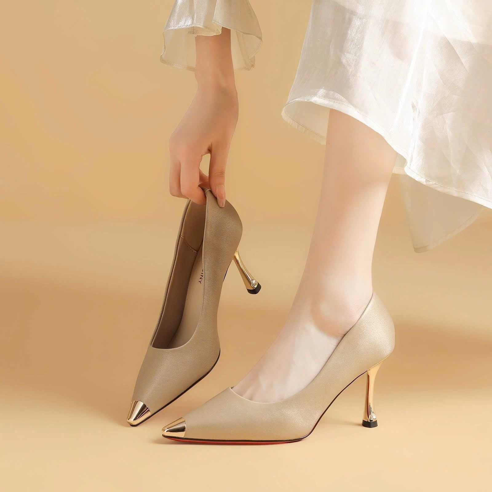 Giày Cao Gót Nữ Mũi Bọc Kim Loại Gót Mạ Crom Đính Đá Cao Cấp NF78-1