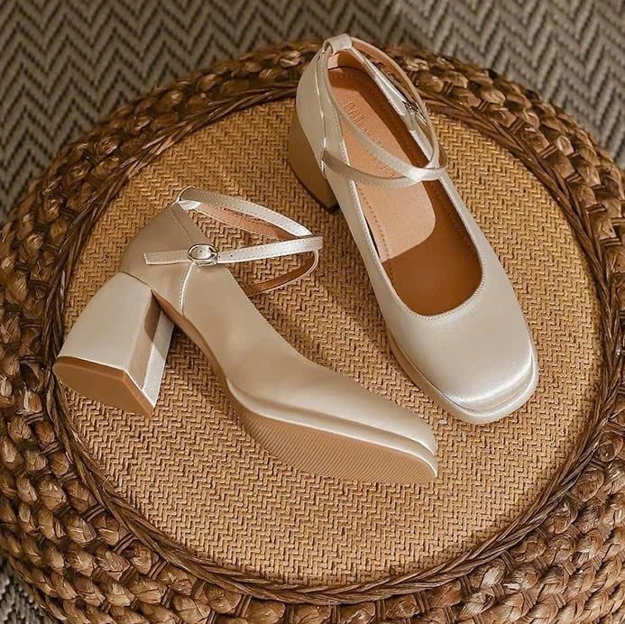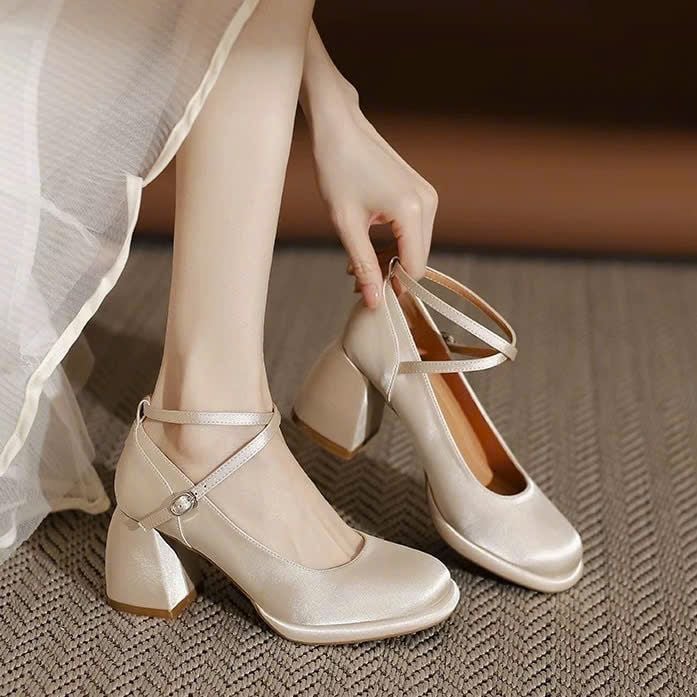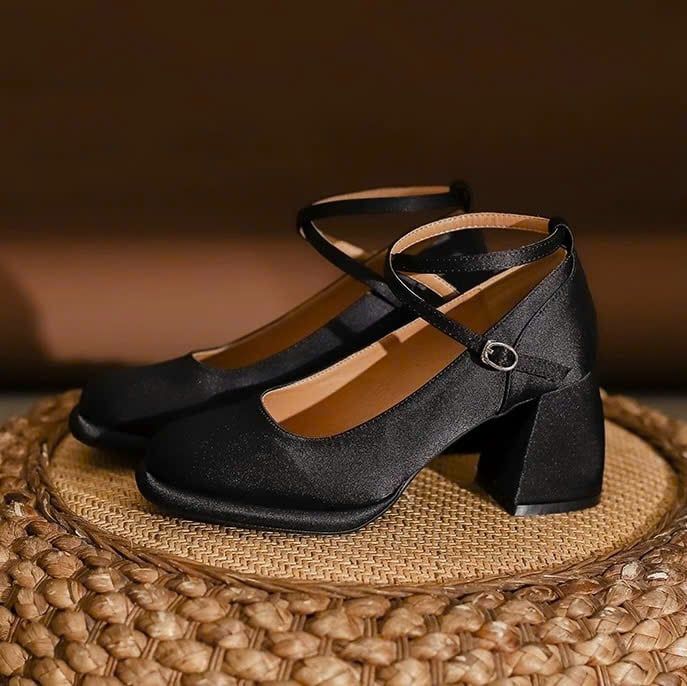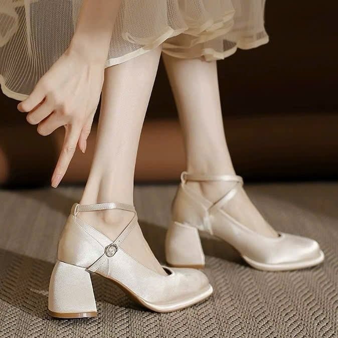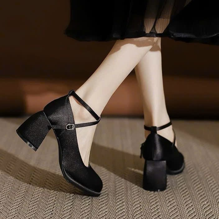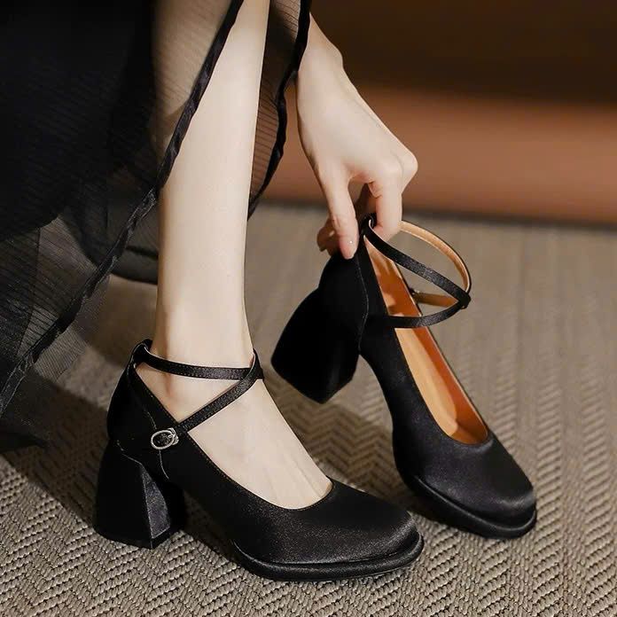 Giày Cao Gót Vuông 7 Phân Da Phối Lụa Satin Cao Cấp 180-3